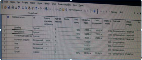 С помощью вкладки Вид открываем Лист ресурсов и вводим туда данные о использованных ресурсах (рабочие, материалы, инструменты и т.д.) Заполняем столбцы с Название ресурса, Тип, Единицы измерения, Стандартная ставка и т.д.