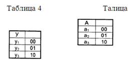 Процесс замены буква алфавита (X, У, А) абстрактного автомата двоичными векторами носит название кодирования и описывается таблицами кодирования. Таблица кодирования имеем следующий вид: в левой части перечисляются все символы абстрактного алфавита, а в правой - соответствующие им двоичные векторы.