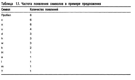 Чтобы проиллюстрировать работу алгоритма, выполним сжатие предложения "How much wood could a woodchuck chuck?" ("Сколько дров мог бы заготовить дровосек?") Прежде всего, предложение необходимо проанализировать. Просмотрим данные и вычислим, сколько раз в предложении встречается каждый символ. Занесем результаты в таблицу (см. таблицу 1.1).