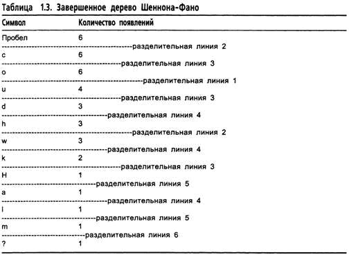 Теперь проделаем то же с каждой из частей таблицы: вставим линию между строками так, чтобы разделить каждую из частей. Продолжим этот процесс, пока все буквы не окажутся разделенными одна от другой. Результирующее дерево Шеннона-Фано представлено в таблице 1.3.