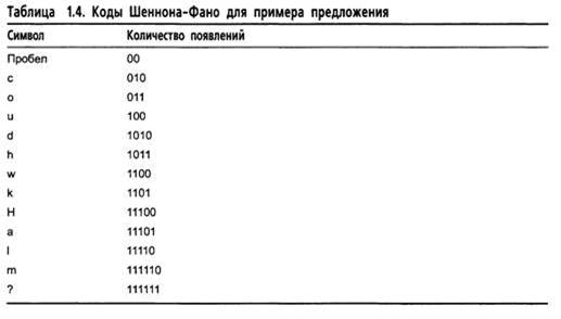Теперь разделим таблицу на две части, чтобы общее число появлений символов в верхней половине таблицы приблизительно равнялось общему числу появлений в нижней половине. Предложение содержит 38 символов, следовательно, верхняя половина таблицы должна отражать приблизительно 19 появлений символов. Это просто: достаточно поместить разделительную линию между строкой o и строкой u. В результате этого верхняя половина таблицы будет отражать появление 18 символов, а нижняя - 20. Таким образом, мы получаем таблицу 1.2.
