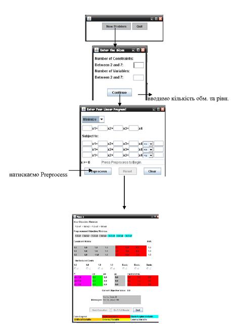 Після запуску програми на виконання програма пропонує ввести такі данні: а) кількість рівнянь та кількість обмежень; б) після цього з’являється вікно в якому потрібно ввести коефіцієнти функції та коефіцієнти рівнянь системи; в) потім потрібно вибрати куди прямує функція (МАХ або MIN); г) вибрати знаки рівності або нерівності (=, ≥, ≤)