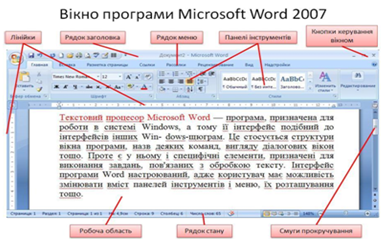 Текстовий процесор Microsoft Word – програма, призначена для роботи в системі Windows, а тому її інтерфейс подібний до інтерфейсів інших Windows-програм. Це стосується структури вікна програми, назв деяких команд, вигляду діалогових вікон тощо. Проте є у ньому і специфічні елементи, призначені для виконання завдань, пов'язаних з обробкою тексту.