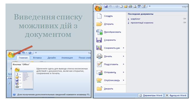 Після клацання будь-якого з його пунктів відображується вкладка із групою команд, призначених для виконання певних операцій. Так, клацнувши системну кнопку Microsoft Office, ми розгорнемо списокможливих дій з файлами документів: