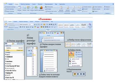 У меню Вставка — команди для вставлення, а в меню Головна — для форматування різних об'єктів. Призначення більшості команд легко зрозуміти з їхніх назв.
