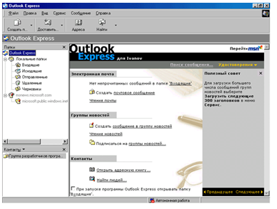 Тека Що входять (Inbox) - сюди зберігаються повідомлення, що приходять. У теці Що входять (Inbox) знаходяться листи e-mail, що підлягають відправці. Відповідно в теці Відправлені (Sent) - повідомлення, які були вже відправлені. Варто відмітити, що сортування повідомлень відбувається автоматично. Наприклад, всі електронні листи, що приходять, поміщаються в теку Що входять (Inbox), а не в яку-небудь іншу. На панелі Контакти знаходиться список людей, з якими ви вже спілкувалися. Але головним, найбільш інформативним є вікно, розташоване праворуч від панелей Теки і Контакти. Залежно від вибраного режиму, тут відображається різна інформація. Наприклад, на мал. 13.9, в головному вікні отображеале вітальне повідомлення. Отже, в полі Електронна пошта (e-mail) ви можете дізнатися про кількість непрочитаних (нових) повідомлень, вибрати команду Читання пошти (Read Mail), для того, щоб переміститися в теку Що входять (Inbox). А також створити нове повідомлення, вибравши Створити поштове повідомлення (Create а new Mail message). Трохи нижче розташовано поле Групи новин (Newsgroups). Якщо ви плануєте працювати з ними, виберіть поле Настройка облікового запису груп новин (Set up а Newsgroup account) (про те, як створити його, буде розказано трохи пізніше). Далі розташовується панель Контакти (Contacts). Вибравши одну з команд, ви можете Відкрити адресну книгу (Open the Address Book) або здійснити пошук людей - Знайти людей (Find People). При кожному запуску програми завантажуватиметься саме це вікно. Якщо ви хочете, щоб автоматично відкривалася палиця Що входять (Inbox), встановите прапорець При запуску програми Outlook Express відкривати теку що 'Входять' (When Outlook Express starts, go directly to my Inbox). Справа розташована панель Корисна рада (Tip of the Day). З неї ви можете дізнатися тонкощі роботи з програмою. Вибравши Пошук повідомлення (Find а Message), ви можете запустити пошук повідомлення.