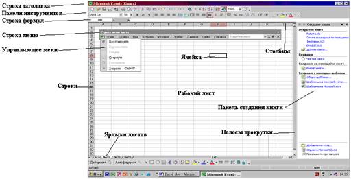 В нижней левой части окна – находятся ярлыки рабочих листов; листы можно добавлять, удалять, переименовывать, переходить между ними.