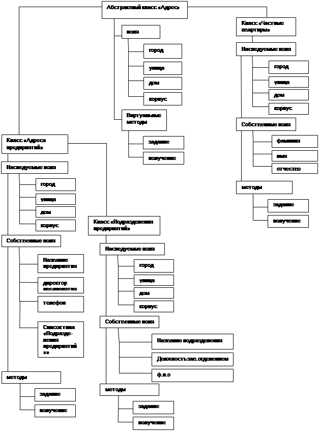 В данной курсовой работе используются два вида наследования. От абстрактного класса Address наследуется класс Flatс помощью классического наследования. Таким образом, класс Flat содержат собственные поля – фамилия(), имя(), отчество(), и наследуемые поля - город(), улица(), дом(), корпус(), собственные и наследуемые от базового класса Address методы, впоследствии переопределенные в производном. Аналогично классу Flat наследуется класс Predpriyatiya.