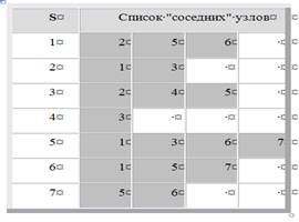 Другой способ представления графа обеспечивает функция, которая выдает списки узлов, с которыми данный узел связан непосредственно. Для графа, отображенного на рис. 2.2.3, такое описание можно представить в виде структуры (таблица 2.1). В колонке s представлены номера узлов, далее в строке таблицы следует список соседних узлов. По этой причине число колонок в каждой из строк различно.