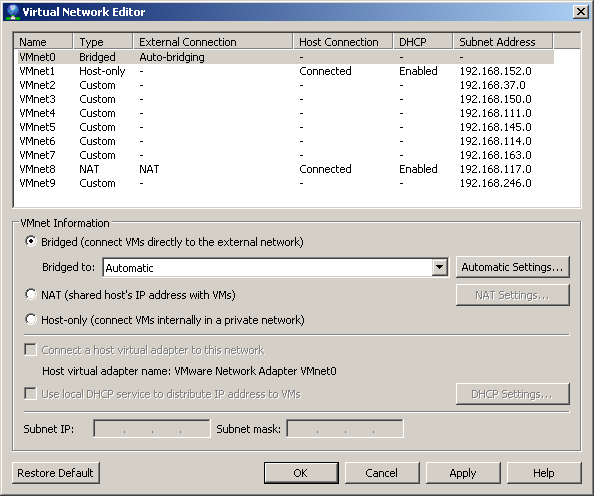 Поддержка сетевых возможностей VMware на базовом компьютере осуществляется с помощью специальных драйверов, которые организуют четыре виртуальных сетевых интерфейса: vmnet0, vmnet1, vmnet2 и vmnet3. Каждый интерфейс ассоциируется с виртуальным Ethernet-хабом, через который к базовому хосту может быть подключено любое число виртуальных компьютеров. Обычно vmnet0 используется в варианте "bridged networking", vmnet1 используется в варианте "host-only networking", а оставшиеся два интерфейса служат для организации варианта "bridged networking and host-only networking". В дополнение к этим интерфейсам имеются два приложения: vmnet-bridge и vmnet-dhcpd (соответствующие файлы находятся в каталоге /usr/bin). Программа vmnet-bridge используется в варианте "bridged networking" для поддержки прозрачного взаимодействия между vmnet0 и реальным сетевым интерфейсом, обычно eth0. Программа vmnet-dhcpd запускается как отдельный процесс в варианте "host-only networking". Этот процесс обеспечивает поддержку протокола DHCP для виртуальных машин, запущенных через vmnet1.