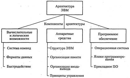 Архитектура ЭВМ охватывает широкий круг проблем, связанных с построением комплекса аппаратных и программных средств и учитывающих множество факторов. Среди этих факторов важнейшими являются: стоимость, сфера применения, функциональные возможности, удобство эксплуатации, а одним из главных компонентов архитектуры являются аппаратные средства. Основные компоненты архитектуры ЭВМ можно представить в виде схемы, показанной на рис. 1.