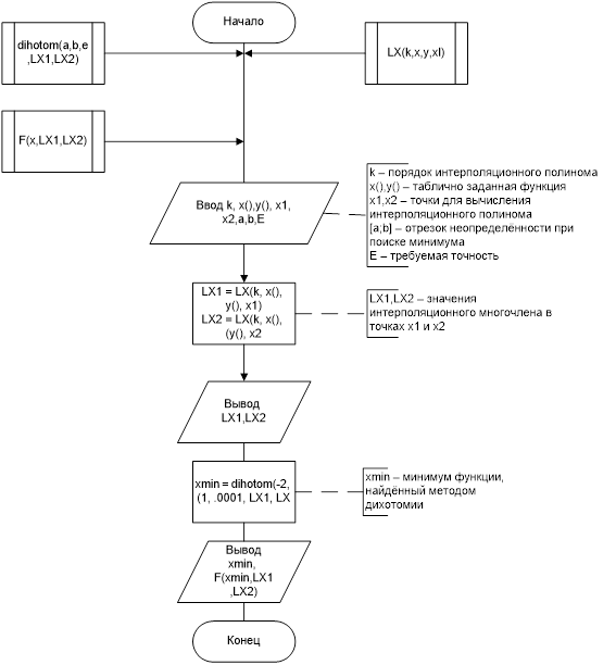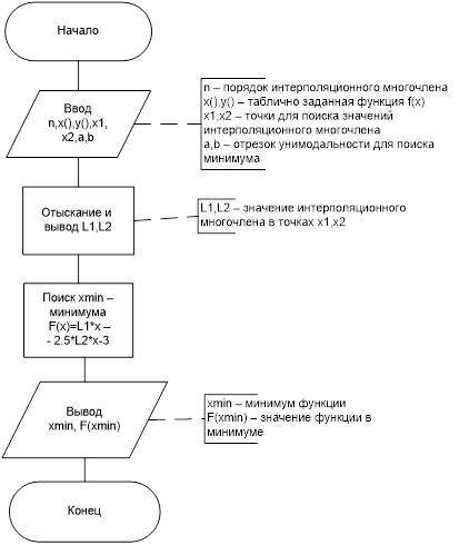 - главный модуль, получающий исходные данные (таблично заданную f(x), a, b, x1 , x2 , ε), передающий их на обработку и выводящий промежуточные и конечные результаты (L(x1 ), L(x2 ), найденный минимум функции)
