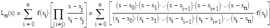 Степень многочлена n обеспечивается n+1 интерполяционным узлом. Для задания таблицы значений функции будем использовать два массива x() и y(). Полином должен удовлетворять условию Ln (xi )=y(i)