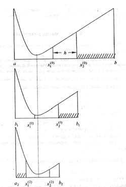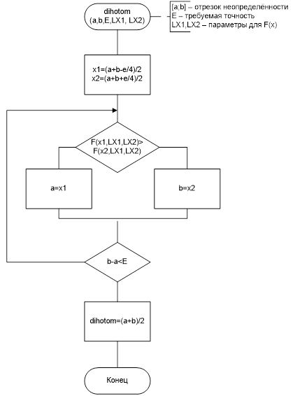 Пусть f(x)- унимодальная на [a;b] и требуется найти минимум f(x) с абсолютной погрешностью Е. Идея метода дихотомии состоит в проведении на каждой итерации двух отсчётов (вычислений значений функции), отстоящих от середины отрезке неопределённости [а;b] на величину de[0;2E] и сравнения значения исследуемой функции в двух точках х( n -1) и