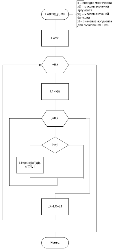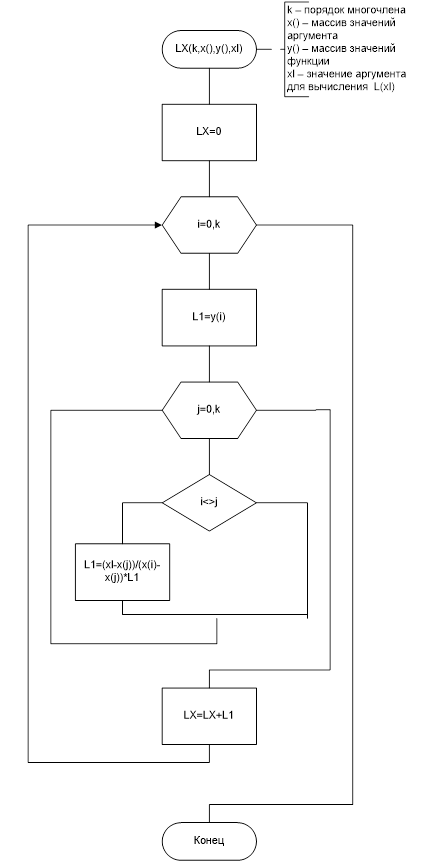 Схема алгоритма модуля поиска значений интерполяционного многочлена в точк e xl