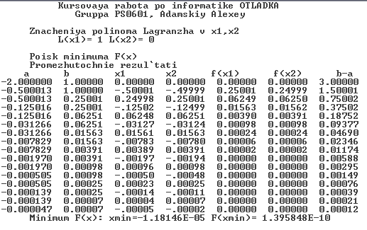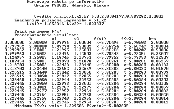 3. Программа модульная, содержит следующие модули: - основной модуль, принимающий исходные данные, передающий их на обработку и выводящий конечный и промежуточный результаты - модуль поиска значений интерполяционного многочлена в точках x1 и x2 - модуль, задающий F(x) с параметрами LX1, LX2, найденными модулем интерполирования - модуль поиска минимума функции F(x) на отрезке [a;b] методом дихотомии