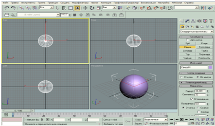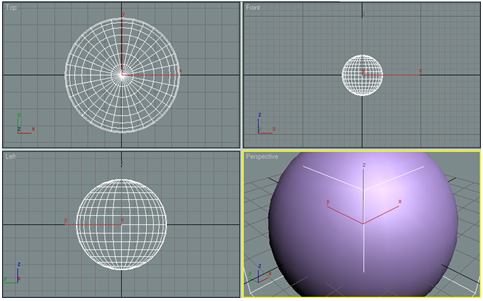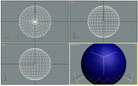 Теперь во всех окнах проекции отображается сфера, как показано на рис. 1.13.