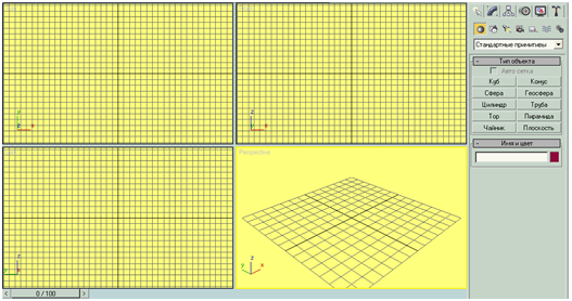 Окна проекций (viewports) позволяют рассмотреть содержимое сцены с различных углов зрения. На рис. 1.8 показано типичное размещение окон проекций, выбранное при открытии 3ds max по умолчанию.