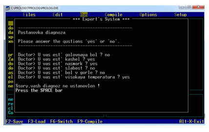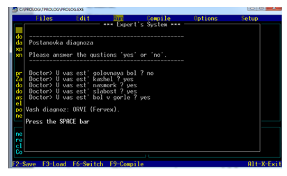 Исходя из приведенной экспертной системы для определения диагноза, можно сделать вывод, что Пролог предоставляет богатые возможности для реализации экспертных систем и написания «дружественного интерфейса» для общения пользователя с программой. Пролог пригоден для разработки систем экспертных консультаций, поскольку в нем имеются и язык представления знаний, и общецелевая стратегия решения задач, основанная на принципе резолюции.