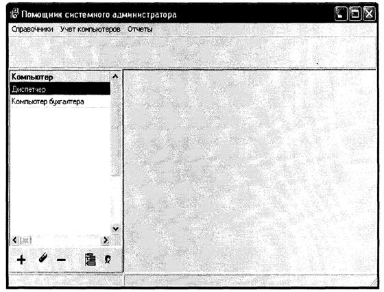 Интерфейс программы во всех окнах должен быть един и удобен для пользователя. Так в любом окне, в котором представлен состав элементов компьютера, должна присутствовать возможность добавления, удаления или редактирования элементов компьютера, а в списке компьютеров — возможность добавления, удаления компьютера или вызова мастера его структуры.