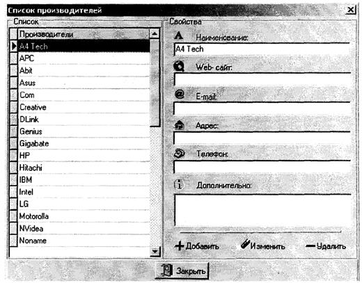 Программа должна позволять пользователю вести списки производителей и поставщиков компьютерного оборудования — добавлять, редактировать, удалять записи о них, данные справочники являются вспомогательными и не являются приоритетной задачей программы, но их наличие позволяет пользователю при формировании состава компьютера выбирать производителя и продавца из списка, а не вводить с клавиатуры.
