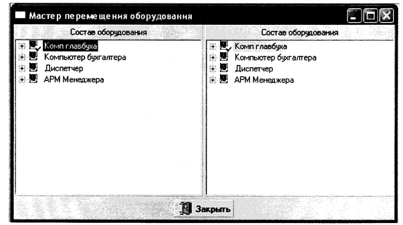 Четвертый режим служит для интерактивного изменения пользователем состава элемента компьютера путем переноса их из других компьютеров. В окне должны отображаться два дерева компьютеров с составом элементов и при помощи функции Drag-and-Drop пользователь может переносить элементы из одного компьютера в другой. Этот режим называется мастером перемещения.