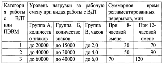 Сведения о регламентированных перерывах, которые необходимо делать при работе на компьютере, в зависимости от продолжительности рабочей смены, видов и категорий трудовой деятельности с ВДТ (видеодисплейный терминал) и ПЭВМ (в соответствии с СанПиН 2.2.2 542-96 «Гигиенические требования к видеодисплейным терминалам, персональным электронно-вычислительным машинам и организации работ») (Таблица 7.6).