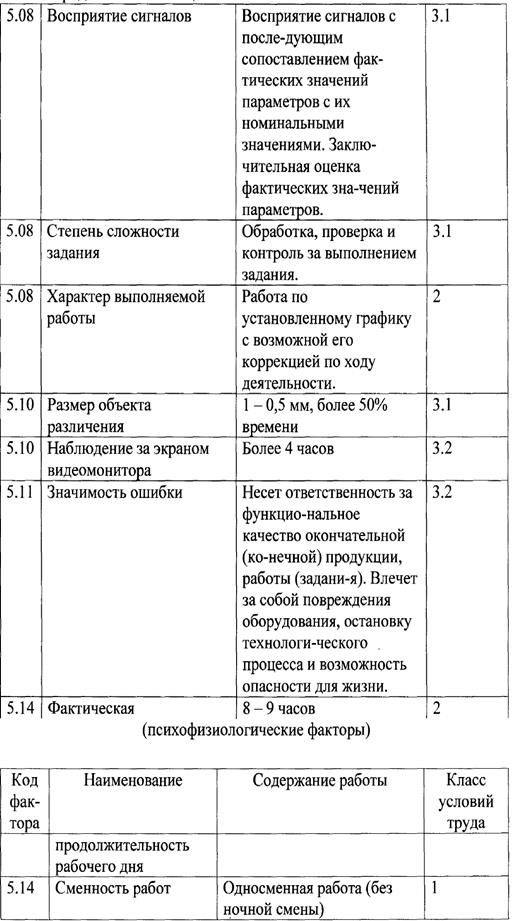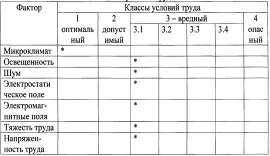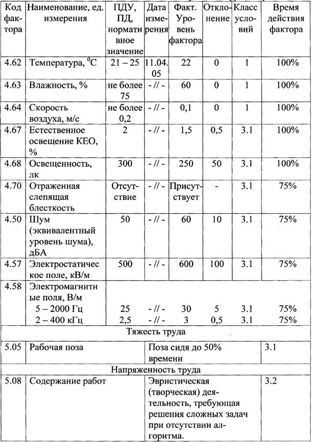 Таблица 7.7 — Фактическое состояние условий труда на рабочем месте