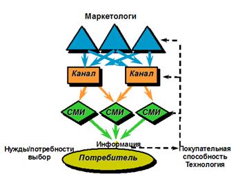 З розвитком і розповсюдженням інформаційних технологій і систем, споживач дістав доступ до інформації про наявні товари і послуги, можливість і право вибору кращих, що і зробило його суверенним. Він вже не залежить від посередника і може диктувати умови виробникові щодо характеристик, комплектації, якості, кількості і навіть ціни необхідного товару. Споживач є ініціатором комунікації з виробником і посередником, що дає право говорити про існування третьої моделі – інтерактивного ринку (рис. 1.3.)