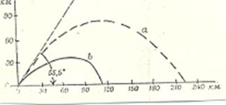 Если бросить тело с некоторой начальной скоростью Vо под углом 45° к горизонту, то его дальность полета будет в два раза больше максимальной высоты подъема тела, брошенного вертикально вверх с такой же начальной скоростью.
