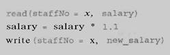 На (рис. 1) используется обозначение read (staffNo = x, salary), указывающее, что требуется считать элемент данных salary для записи, в которой ключевое значение равно х. В данном примере транзакция состоит из двух операций, выполняемых в базе данных (read и write), и одной операции, выполняемой вне базы данных (salary = salary * 1.1).