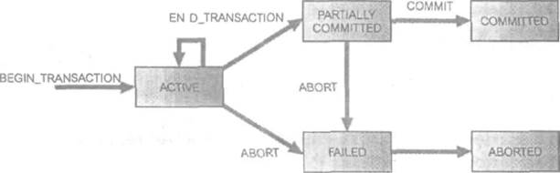 Порядок выполнения операций транзакции принято обозначать с помощью диаграммы переходов. Пример такой диаграммы приведен на (рис. 2). Следует отметить, что на этой диаграмме, кроме очевидных состояний ACTIVE, COMMITTED и ABORTED имеются еще два состояния, описанные ниже.