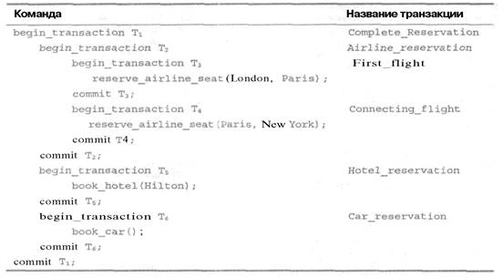 Модель вложенных транзакций. Транзакция рассматривается как коллекция взаимосвязанных подзадач или субтранзакций, каждая из которых также может состоять из любого количества субтранзакций. Модель вложенных транзакций была предложена Моссом (Moss) в 1981 году. В этой модели вся транзакция рассматривается как набор связанных подзадач, называемых субтранзакциями, каждая из которых также может состоять из произвольного количества субтранзакций. В данном определении полная транзакция представляет собой древовидную структуру или некоторую иерархию субтранзакций. В модели вложенных транзакций присутствует транзакция верхнего уровня, содержащая некоторое количество дочерних транзакций, каждая из которых, в свою очередь, может включать вложенные транзакции, и т.д. В исходном варианте, предложенном Моссом, выполнять операции в базе данных разрешается только транзакциям самого нижнего уровня (субтранзакциям самого нижнего уровня вложенности). В табл. 2 приведен пример вложенной транзакции Т1 , в которой выполняется резервирование места в гостинице, заказ билетов на самолет и аренду автомобиля. Она включает субтранзакции заказа авиабилетов (Т2 ), бронирования места в отеле (Т5 ) и найма автомобиля (Т6 ). Транзакция заказа авиабилетов тоже является вложенной и состоит из двух субтранзакций: заказа билета для перелета из Лондона в Париж (Т3 ) и бронирования места на соответствующем рейсе из Парижа в Нью-Йорк (Т4 ). Завершение работы транзакций должно происходить в направлении снизу вверх. Следовательно, транзакции Т3 и Т4 должны закончить свою работу до завершения работы их родительской транзакции T2 , а работа транзакции Т2 должна быть завершена до окончания работы ее родительской транзакции Т1 . Однако отмена транзакции на некотором уровне не оказывает влияния на выполнение транзакций более высоких уровней. Вместо этого родительской транзакции разрешается выполнить свою собственную операцию восстановления нормальной работы, воспользовавшись одним из следующих допустимых способов.