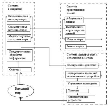 Обобщенная функциональная структура ИС показана на рис. . и включает три основные взаимосвязанные системы: восприятия, представления знаний, планирования и исполнения действий.