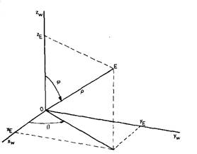 Для выполнения видовых преобразований должны быть заданы точка наблюдения, совпадающая с глазом, и объект. Будет удобно, если начало ее координат располагается где-то вблизи центра объекта, поскольку объект наблюдается в направлении от Е к О. Пусть точка наблюдения Е будет задана в сферических координатах f , q, rпоотношению к мировым координатам. То есть мировые координаты (точки Е) могут быть вычислены по формулам: