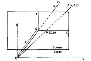 Точки в двухмерном и трехмерном пространствах представляются координатами (X, Y) и (х, у, z) соответственно. При необходимости получения перспективной проекции задается большое количество точек P(x, у, z), принадлежащих объекту, для которых предстоит вычислить координаты точек изображения Р'(Х, Y) на картинке. Для этого нужно только преобразовать координаты точки Р из мировых координат (х, у, z) в экранные координаты (X, Y) ее центральной проекции Р'. Предположим, что экран расположен между объектом и глазом Е. Для каждой точки Р объекта прямая линия РЕ пересекает экран в точке Р'.