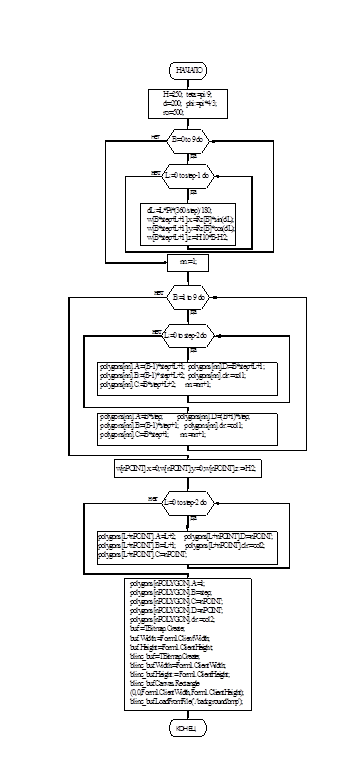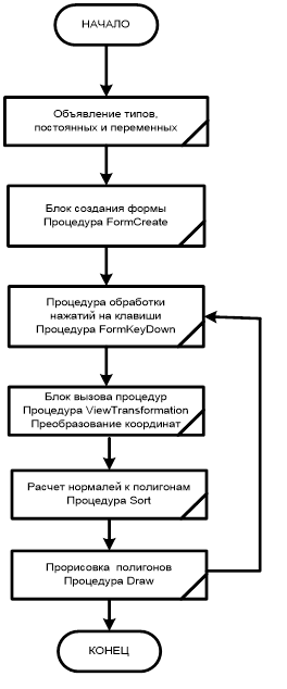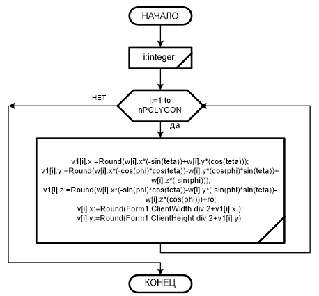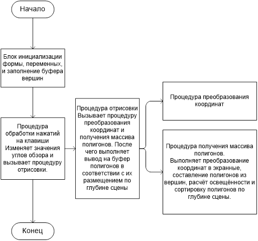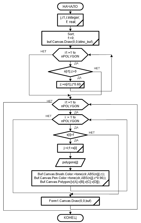 Процедура рисования вызывает последовательно блок преобразования координат и процедуру составления полигонов из точек. Затем выполняет рисование полигонов в промежуточном буфере и совмещение результата с буфером отображения.