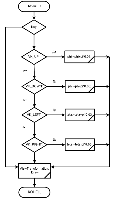 Блок вращения меняет значения углов обзора в соответствии с нажатиями на клавиши позиционирования и вызывает процедуру отрисовки.