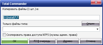 Ця команда дозволяє копіювати файли та папки. Для цього потрібно вибрати, тобто, виділити необхідні для копіювання файли та натиснути клавішу F5 на клавіатурі. Відкриється діалогове вікно, де потрібно ввести шлях до папки, куди копіюватимуться файли, а також маска файлів. За замовчуванням шлях до папки представлено разом з маскою файлів «*.*», що означає «всі файли з будь-яким розширенням». Можна використовувати будь-який тип імен файлів дискової операційної системи (DOS) , включаючи непередбачувані. В полі трохи нижче при необхідності визначається, що тільки файли певного типу будуть скопійовані до цільової папки. Наприклад, можна скопіювати файли тільки з розширенням *.xls .