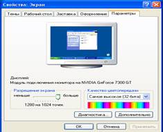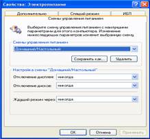 Вкладка Оборудование позволяет установить на компьютере новое оборудование, задать несколько вариантов комплектации компьютера. Также на этой вкладке находится кнопка запуска диспетчера устройств, который используется для настройки уже установленного оборудования. При его запуске открывается диалоговое окно, в котором перечисляется оборудование, входящее в состав компьютера. Здесь также имеются средства для управления этим оборудованием. Используя меню Вид, можно задать способ группировки устройств в списке: Устройства по типам и Устройства по подключению. Кнопка Отобразить окно свойств позволяет вывести характеристики выделенного устройства, в том числе и используемые им драйверы. Кнопка Обновить конфигурацию оборудования служит для проверки информации в списке и приводит его в соответствие со сделанными изменениями. Кнопка Удалить исключает устройство из списка.