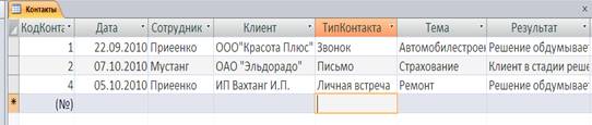3. Контакты (рис. 3) – отображает тип, тему и результат контакта