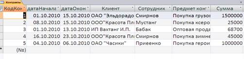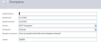 Потом заполняются форма «Регистрация сотрудников» (рис.10), форма «Регистрация клиентов» (рис.11), затем форма «Регистрация контрактов» (рис.12). По этим данным формируется запрос и отчет.