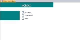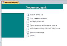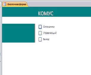 Также база данных содержит формы: «Кнопочная форма» - обобщающая форма, в ней содержатся кнопки, «Сотрудники», «Управляющий», «Выход». Они помогают предоставить пользователю средства для заполнения только тех полей, которые ему заполнять положено. Одновременно с этим в форме размещены специальные элементы управления (счетчики, раскрывающиеся списки) для автоматизации ввода.