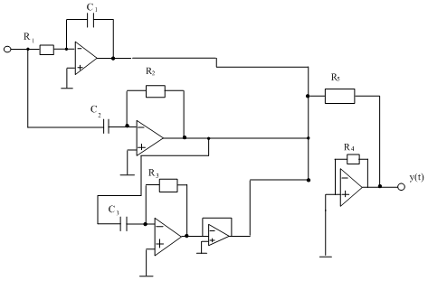 На основі вихідного рівняння будуємо аналогову схему цифрового фільтру з використанням операційних підсилювачів.