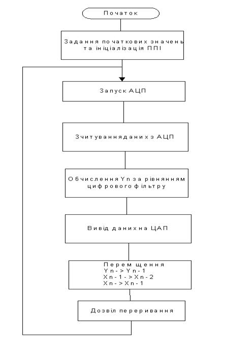 МПП був побудований на МП КР580ВМ80. Для заданого рівняння системи регулювання було здійснено його часткову дискретизацію і отримано відповідне рівняння цифрового фільтра (ЦФ). Побудувано аналогову схему, яка відображає задане рівняння.Складено і детально описано структурну схему МПП, включаючи опис кожної складвої частини МПП .Складено схему алгоритму функціонування МПП. Обрано типи мікросхем АЦП і ЦАП, вибір здійснювався переважно по такому параметру як швидкість перетворення інформації. Складено принципову схему підключення елементів МПП. Була розроблена програма на мові асемблеру мікропроцесора КР580ВМ80 для вводу інформації через АЦП і виводу через ЦАП, з використанням паралельного програмованого інтерфейсу , який працював в асинхронному режимі обміну інформацією. Складено програму відповідної цифрової обробки інформації. Детально описано фрагмент принципової схеми реалізації функціонального вузла К589АП26. Практично засвоєно та удосконалено навики розробки мікропроцесорних систем.