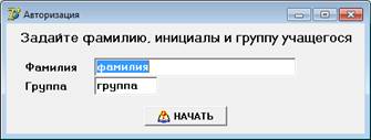 В программе используется переменная FormAvto , которая представляет собой экранную форму. Объекты экранной формы были приведены в таблице 2.1. У формы имеется лишь один обработчик нажатия на кнопку BitBtnStart. Текст обработчика приведен в строках 26–32 листинга из приложения Б. В теле обработчика происходит считывание введенных имени и фамилии учащегося и его группы в переменные, после чего исходная форма скрывается и активизируется форма тестирования.