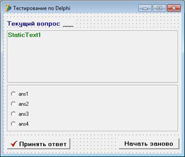 | StaticText1 | TStaticText | поле, в котором будет выводиться очередной вопрос |