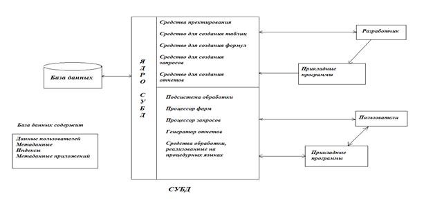 СУБД используется разработчиками и пользователями, обращающимися к СУБД напрямую или косвенно, через прикладные программы. На рисунке 1 представлена схема компонентов системы базы данных.