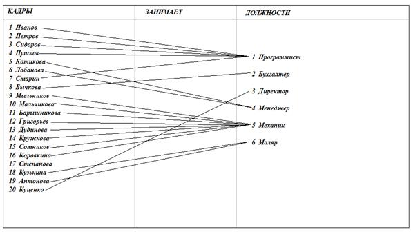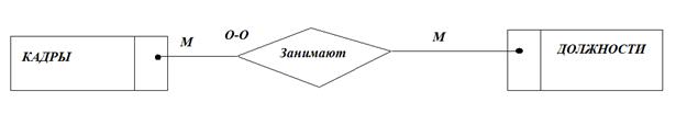 Диаграмма (Рис.2) показывает, какую конкретную должность занимает каждый из работников. При этом связь М:1 (многие - к одному) указывает, что одну должность может занимать несколько работников, а класс принадлежности О-О (обязательный-обязательный) показывает, что каждый должность должна быть занята работниками.