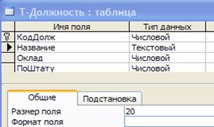 При формировании таблиц следует рационально использовать внешнюю память. Для этого указываем Размер поля необходимый для нашего случая 20 символов, а не 50 (Рис.7).